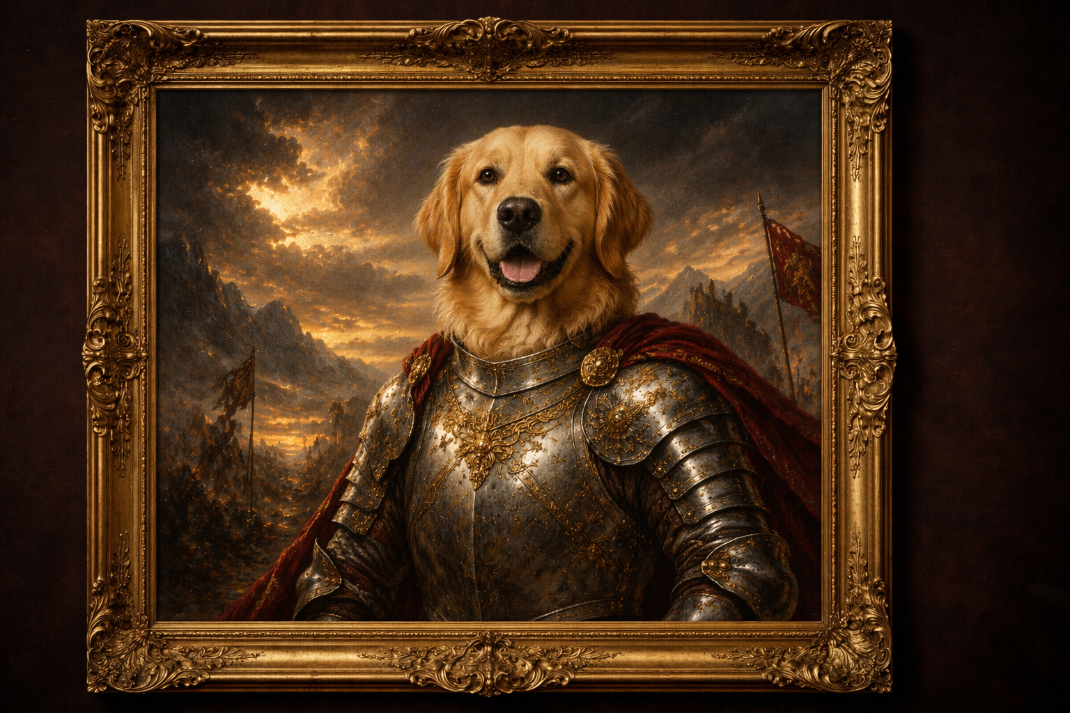 Dein Begleiter als mittelalterlicher Ritter – in detaillierter Silberrüstung mit goldenen Gravuren und wehendem Cape. Giclée-Druck auf 200g säurefreiem Mattpapier aus zertifiziert nachhaltiger Produktion. Ein Denkmal für stille Helden.