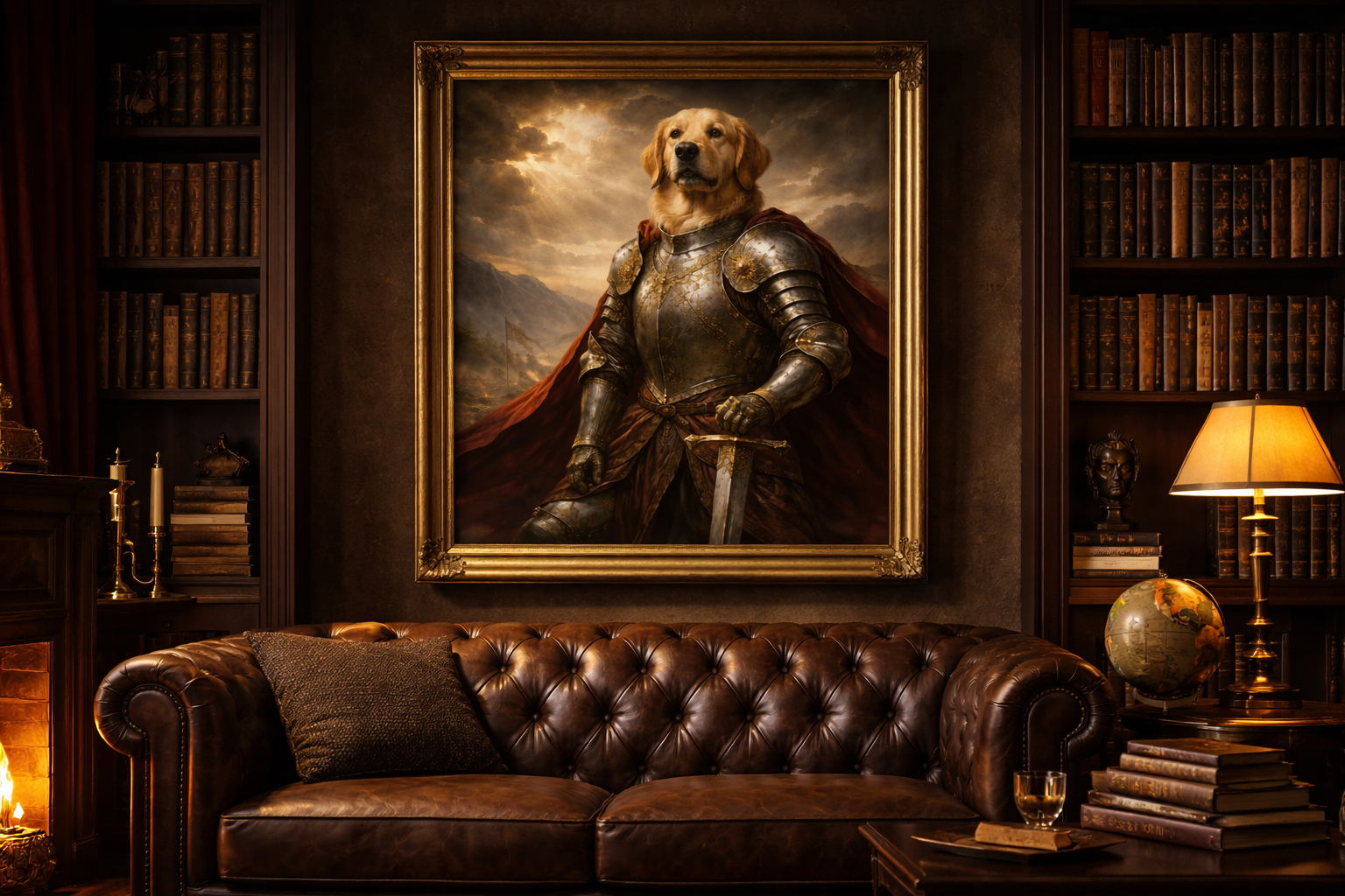 Dein Begleiter als mittelalterlicher Ritter – in detaillierter Silberrüstung mit goldenen Gravuren und wehendem Cape. Giclée-Druck auf 200g säurefreiem Mattpapier aus zertifiziert nachhaltiger Produktion. Ein Denkmal für stille Helden.